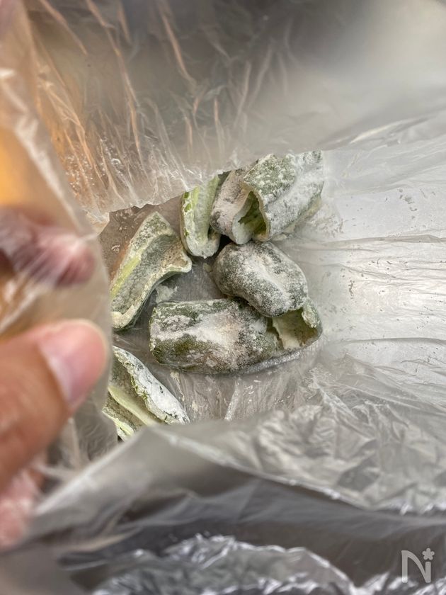 (2) 別のポリ袋にピーマンと米粉(薄力粉)を入れ、しゃかしゃか振る。