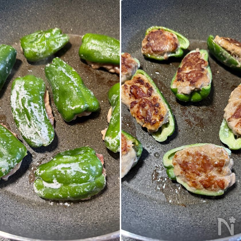 *ピーマンに米粉(薄力粉)をまぶしておくことで、肉だねが剥がれにくくなります。