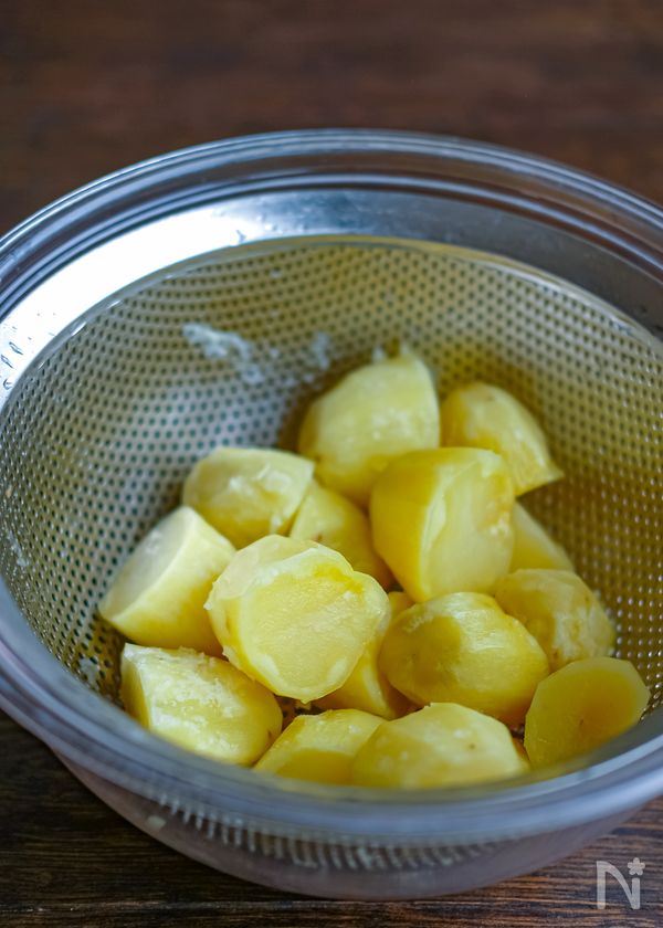 (2) じゃがいも(メイクイーン)は皮を剥き、大き目のひと口大に切り、耐熱ボウルに入れ、水大さじ1(分量外)をまぶしてラップをかけて電子レンジ600wで10分(2人分の場合は6分)加熱しザルに上げて水気を切る。