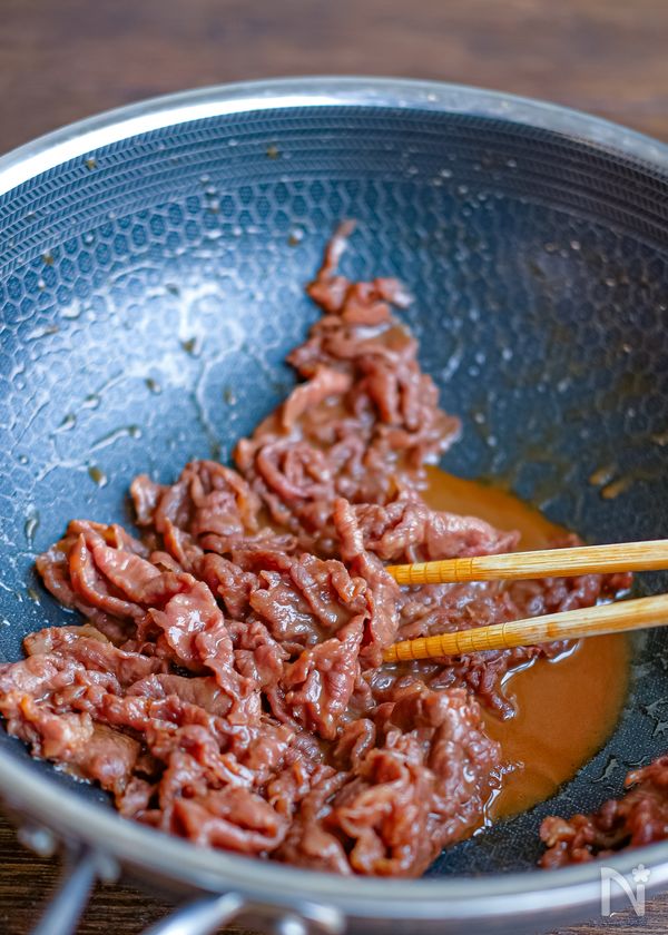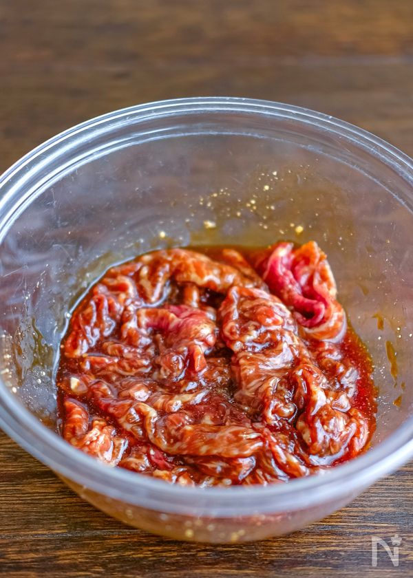 (1) ボウルに【A】をまぜ、牛こま切れ肉を入れて絡める。
