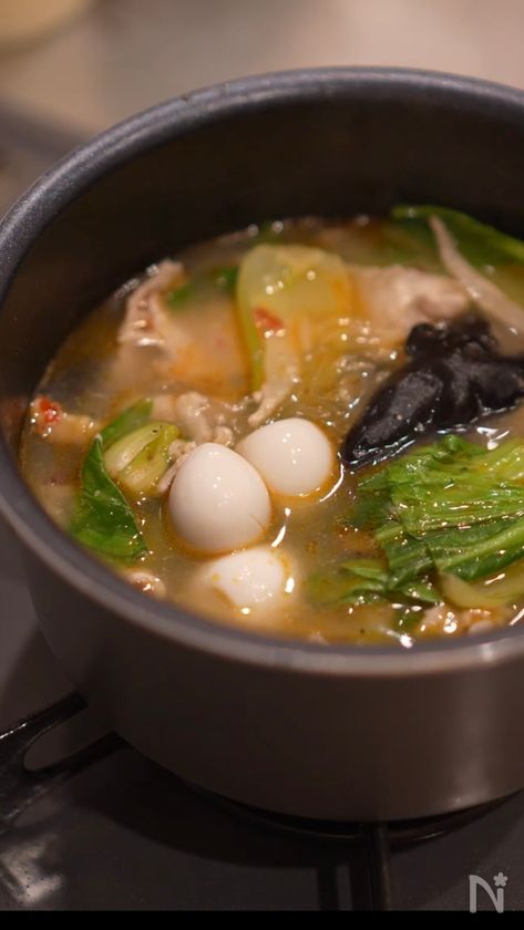 (5) 仕上げに味噌を溶き入れて、うずらの卵を加えて弱火で2分加熱する。