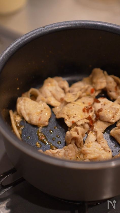 (3) 2に豚こま肉を入れ、豚肉の色が変わるまで炒める。