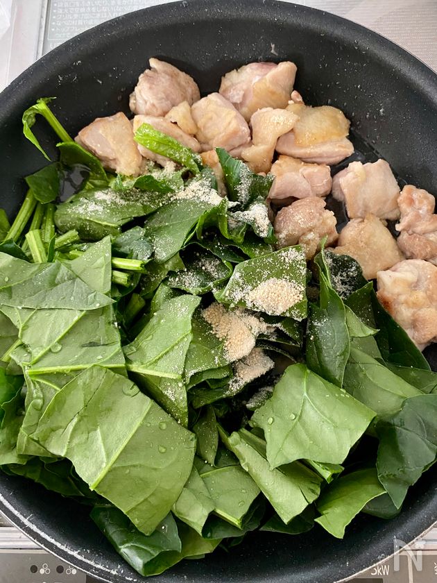 【A】・ほうれん草も加えて全体を混ぜ、フライパンのフタをして中火で2分ほど火にかける。