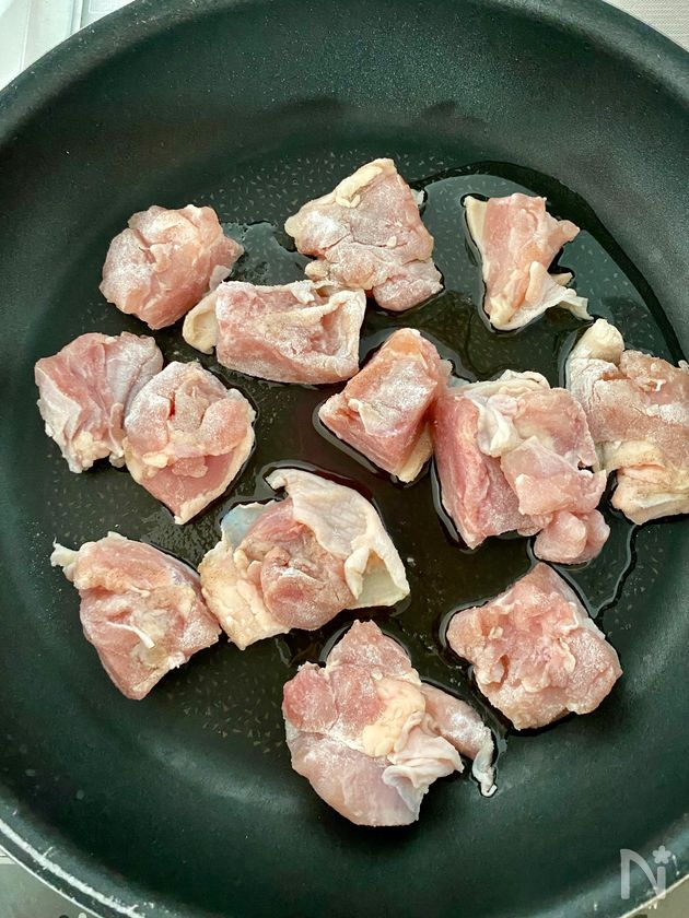(1) こめ油をひいたフライパンを熱し、鶏肉を皮目から焼き色がつくまで両面焼く。(5分程。8割火が通った状態)