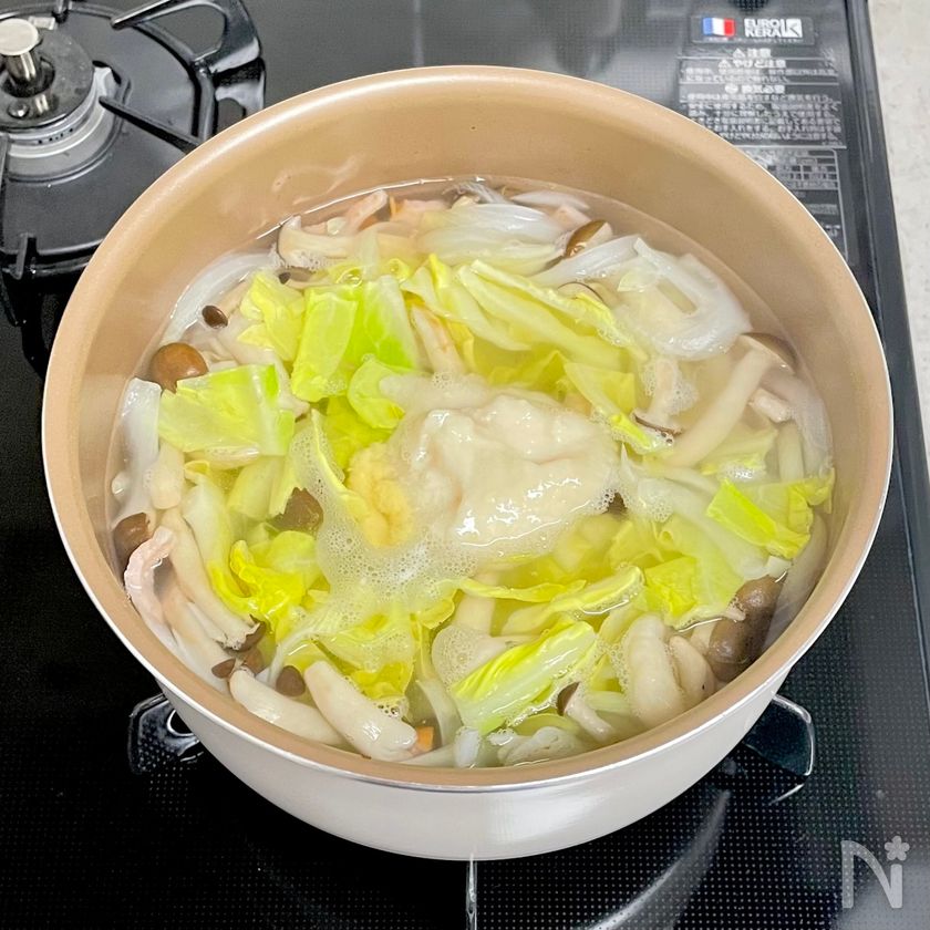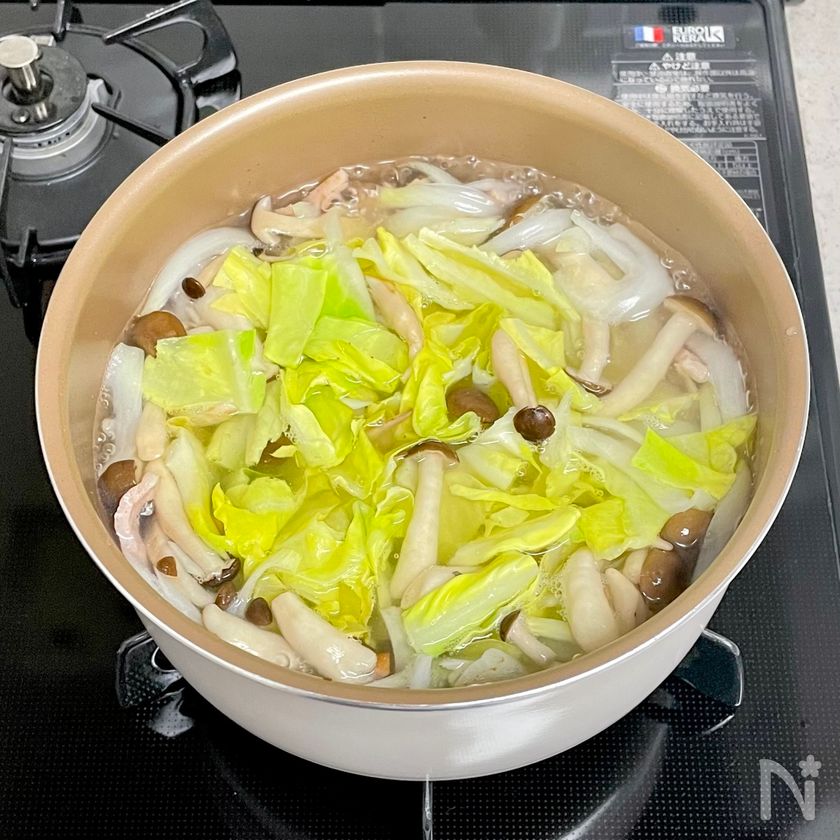 (3) 玉ねぎがしんなりしたらを、水加えてひと煮立ちさせ、キャベツを加える。