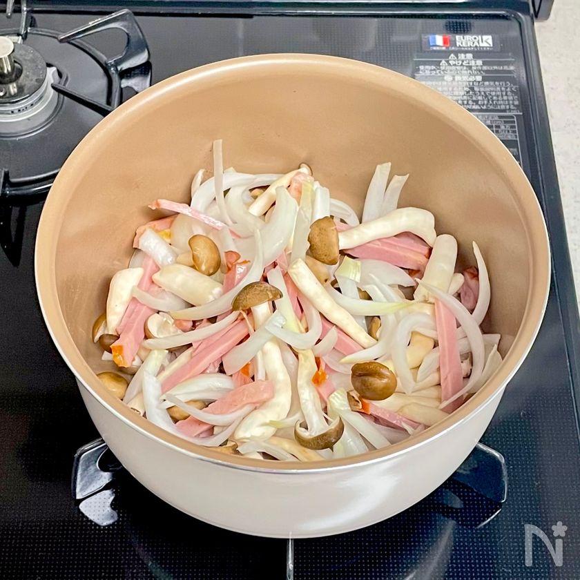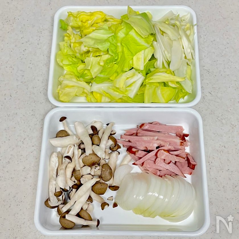 (1) 春キャベツは食べやすい大きさのざく切りに、新玉ねぎは繊維に沿って薄切りにする。しめじは小房に分け、ベーコンは5mm幅に切る。