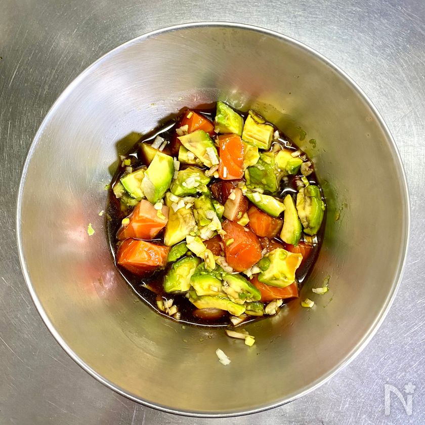 食べる直前にアボカドと長ねぎを漬け汁に加える。