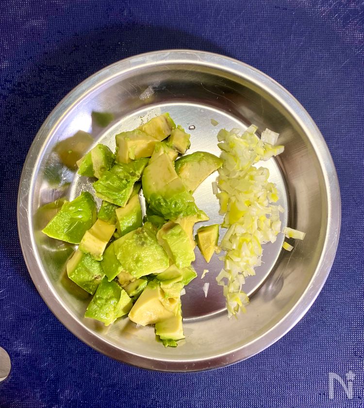 アボカドは種と皮を除いて1cm角に切り、レモン汁を回しかけ、冷蔵庫で冷やす。