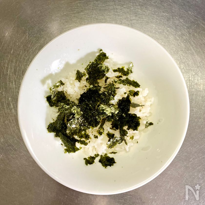 (4) 器にご飯を盛り、直火で5~6回返しながらあぶって細かくちぎった焼きのりをちらす。