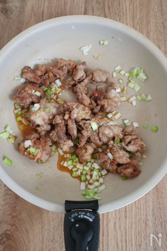(4) 油を取り除いたフライパンに再度豚細切れ肉を入れ、みじん切りにした長ネギと【A】を加え、全体に味がなじむように煮絡める。