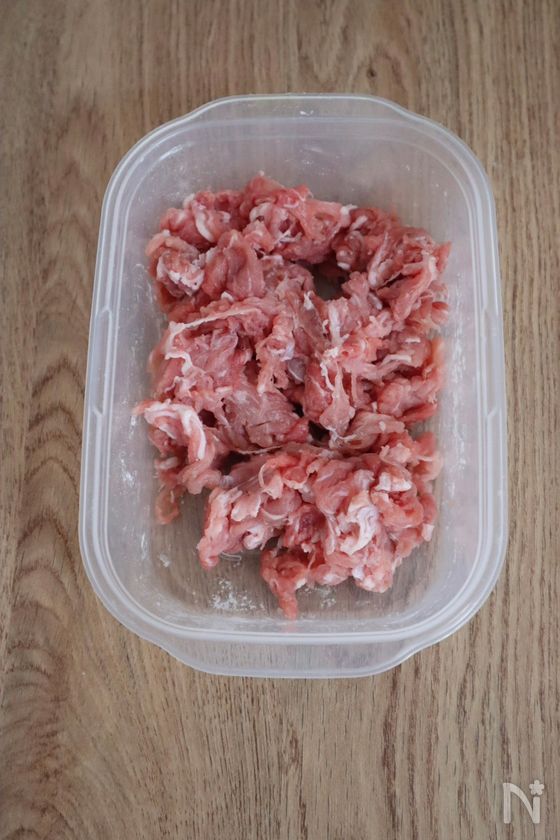(1) 豚細切れ肉全体に塩こしょうと片栗粉をまぶす。