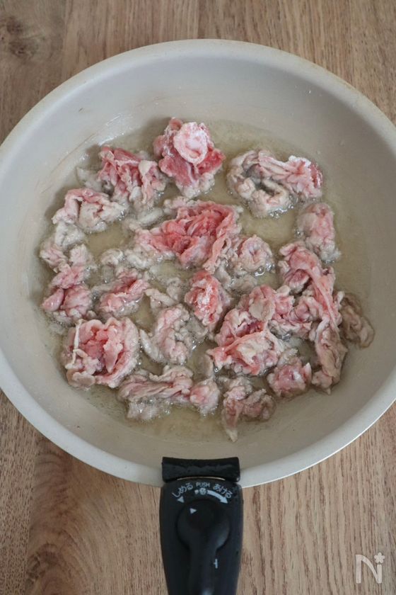 (2) 中火で熱したフライパンに高さ5mm程度になるようにサラダ油を入れ、170度に熱したら豚細切れ肉を入れ、全体に火が通るまで揚げ焼きにする。