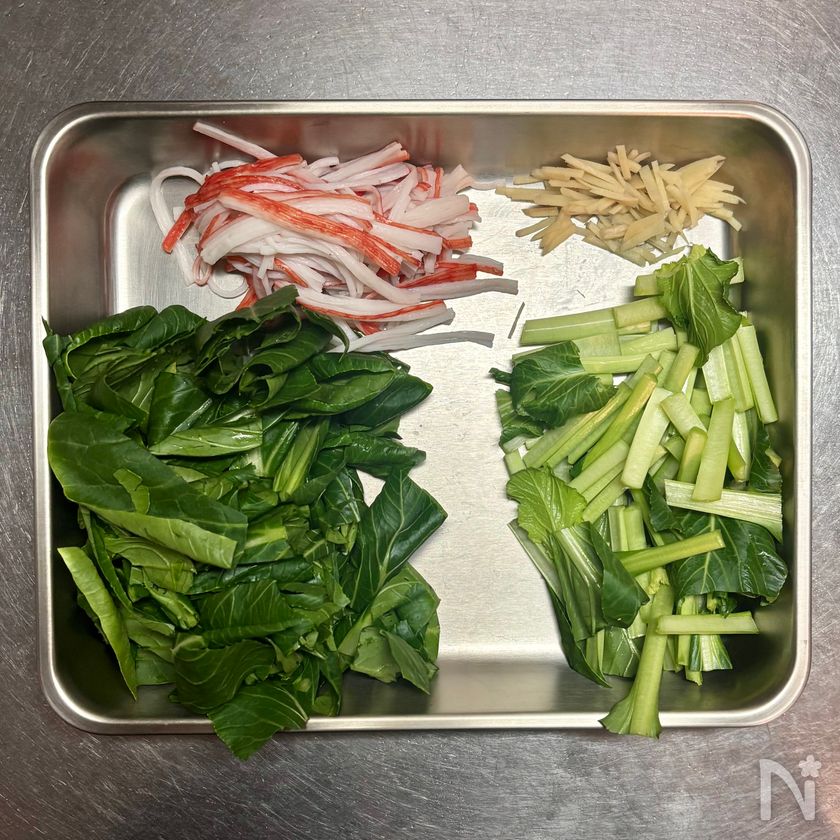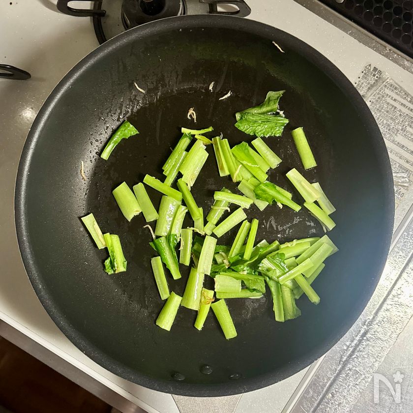 小松菜の茎を入れ、さらに1分ほど炒める。
