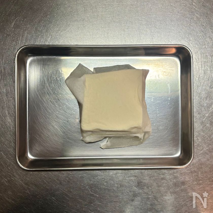 (1) 絹ごし豆腐はクッキングペーパーに包み、5分ほどおいて水きりをする。