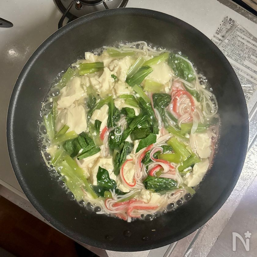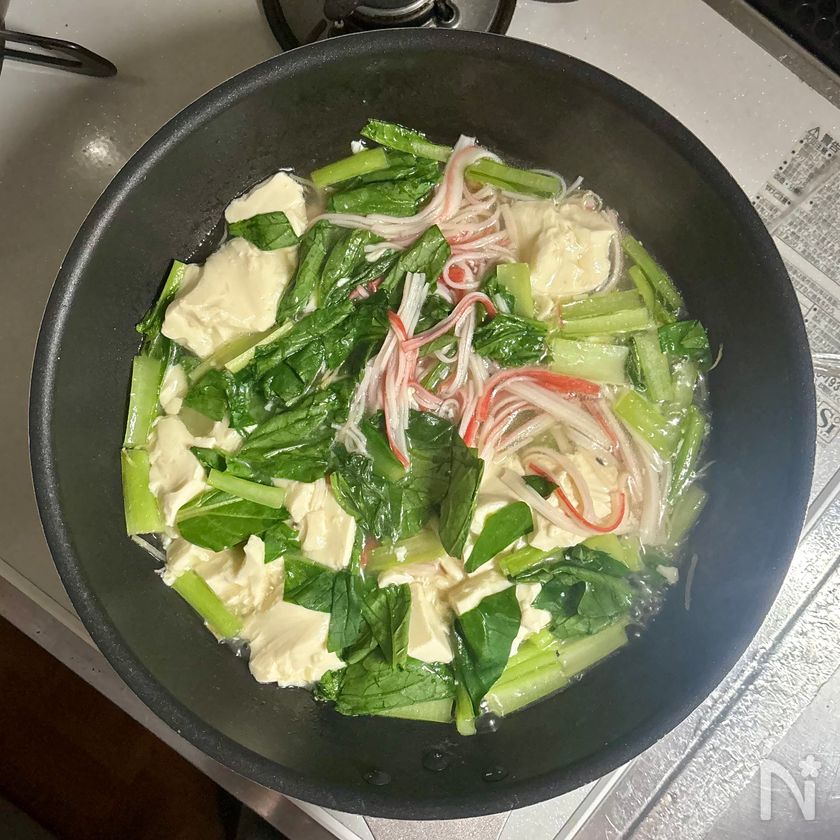 (6) 小松菜の葉、かにかまぼこを加え、豆腐の中が温まり、小松菜が好みの固さになるまで1〜2分煮る。