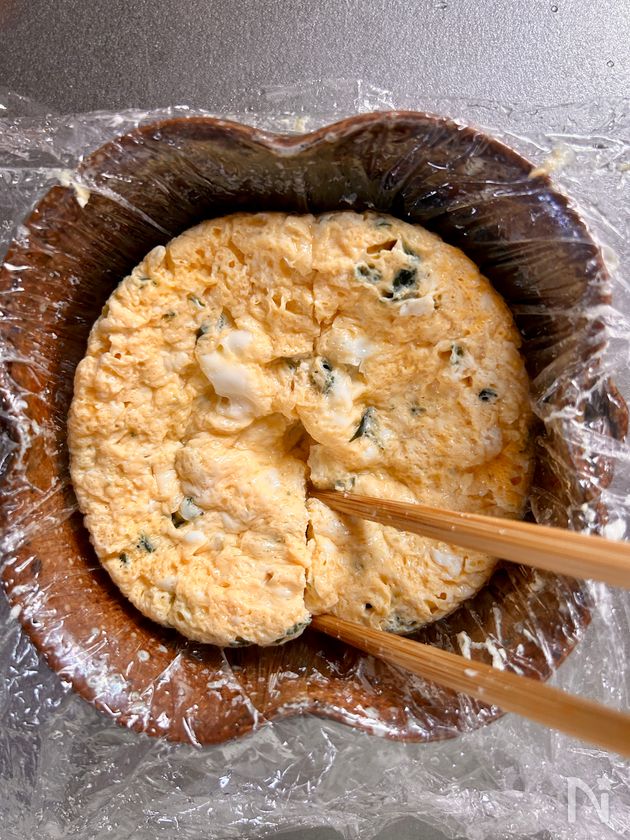 (3) ラップで軽く覆い、電子レンジ600wで3分加熱する。