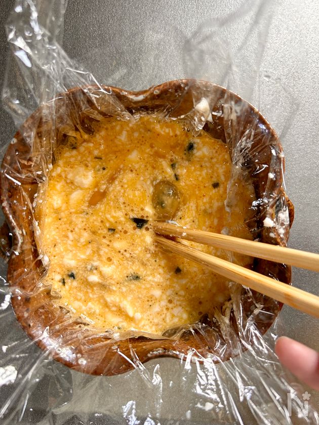 (2) 卵、しらすと刻んだわかめ、醤油を入れて混ぜる。