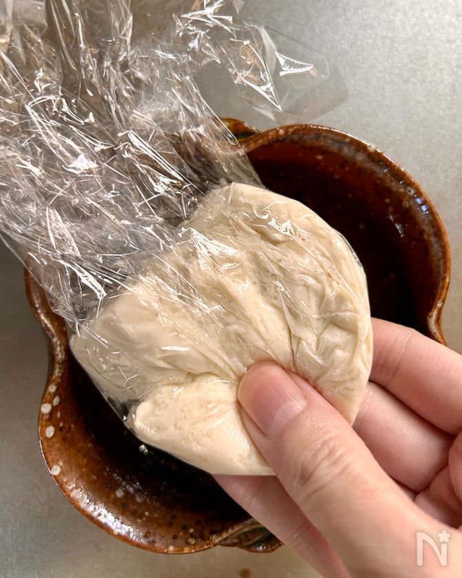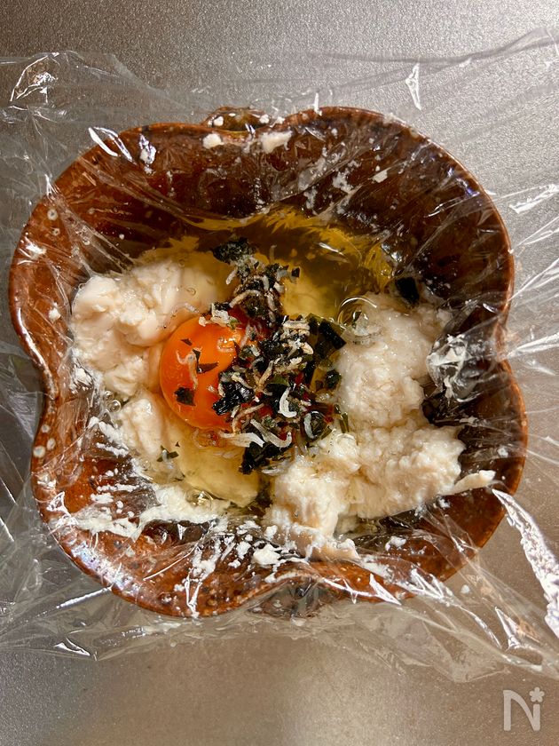 (1) 耐熱皿にラップを敷き、絹豆腐を入れて手で潰す。