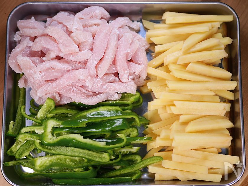 ○ピーマンは縦の細切り、じゃがいもは皮をむき細切りにする。