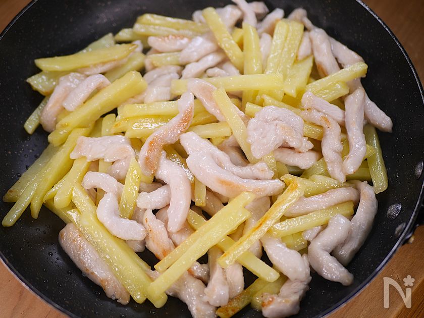 (3) ○フライパンにサラダ油(大さじ1.5)、鶏むね肉、じゃがいも、塩ひとつまみ(分量外)を入れ、具材をばらしながら強火で2~3分炒め油を回す。