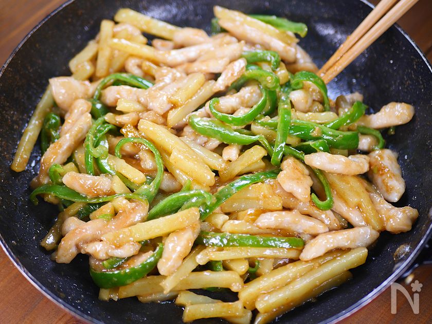 濃厚オイスターマヨの🤭💕鶏むね肉とじゃが芋の青椒肉絲🍚