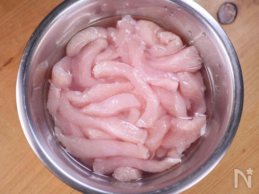 ✅ぱさつきがちな鶏むね肉をしっとりジューシーにし、また下味もつけます。肉が少し厚いので下味は大事!