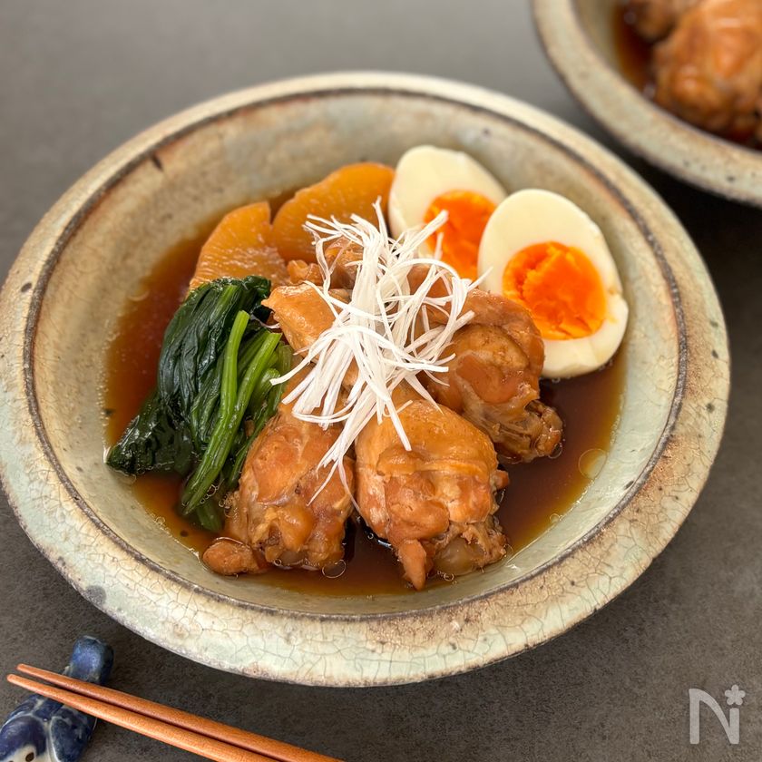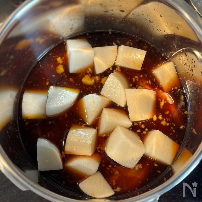 (2) 圧力鍋に手羽元、大根の順に入れ、【A】を入れる。