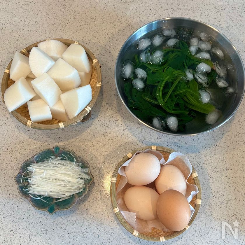 (下準備) ・大根は7cm幅のイチョウ切りにする。