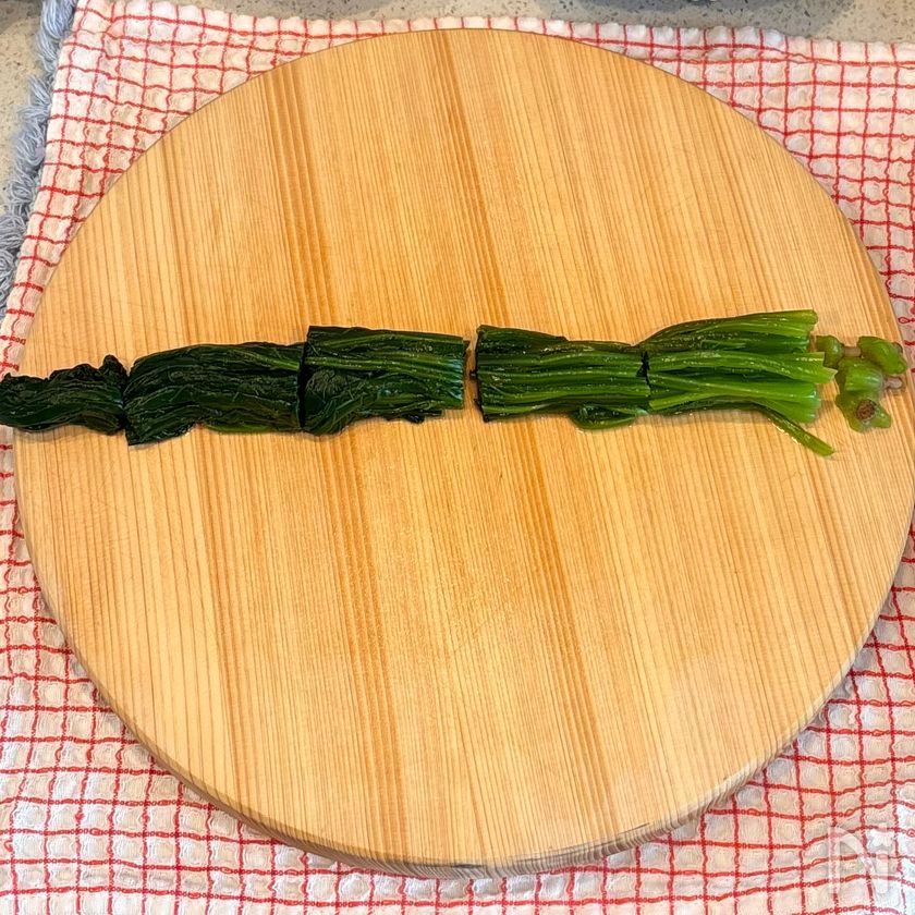 (1) ほうれん草の水気をしぼり、5cm幅に切る。