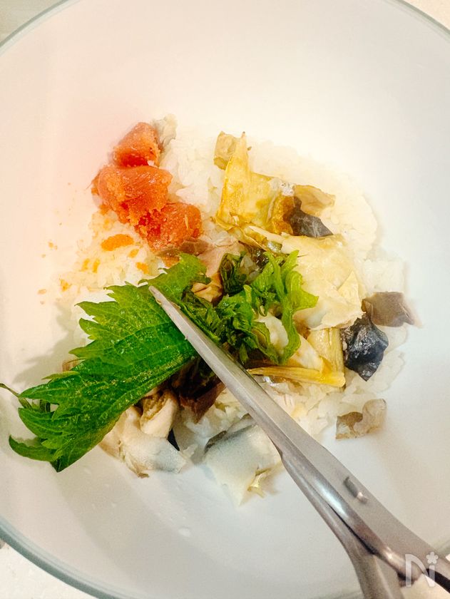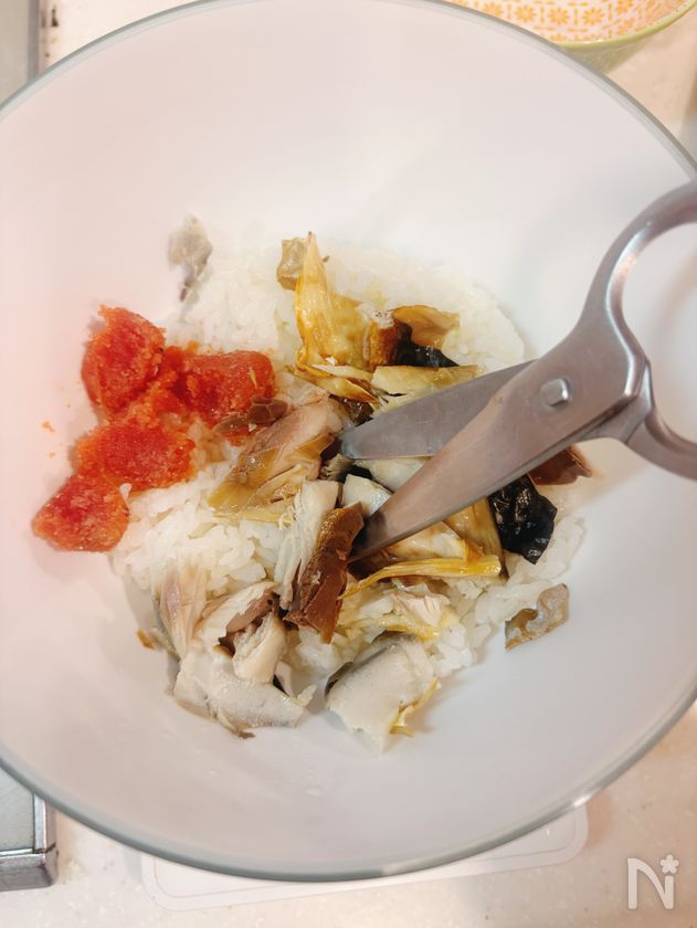 (1) ボールにご飯、塩さば、明太子を入れほぐしながら混ぜる。