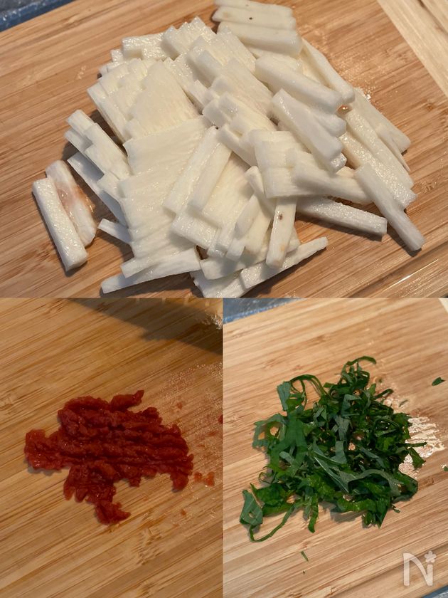 (1) 長芋は皮を剥き、0.5〜1cm幅の細切りにする。梅干しは種を取って刻み、大葉は細切りにする。