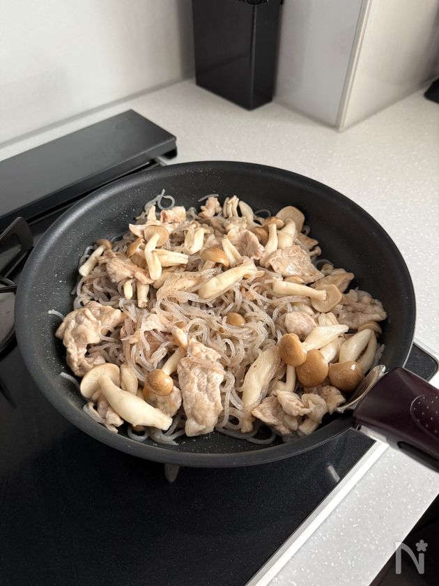 (3) フライパンにごま油を中火で熱し、豚こま切れ肉を入れて色が変わるまで炒めたら、しめじ、糸こんにゃくを加えて全体に油が回るまで炒める。