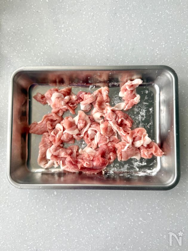 (2) 豚こま切れ肉は食べやすい大きさに切って片栗粉をまぶす。