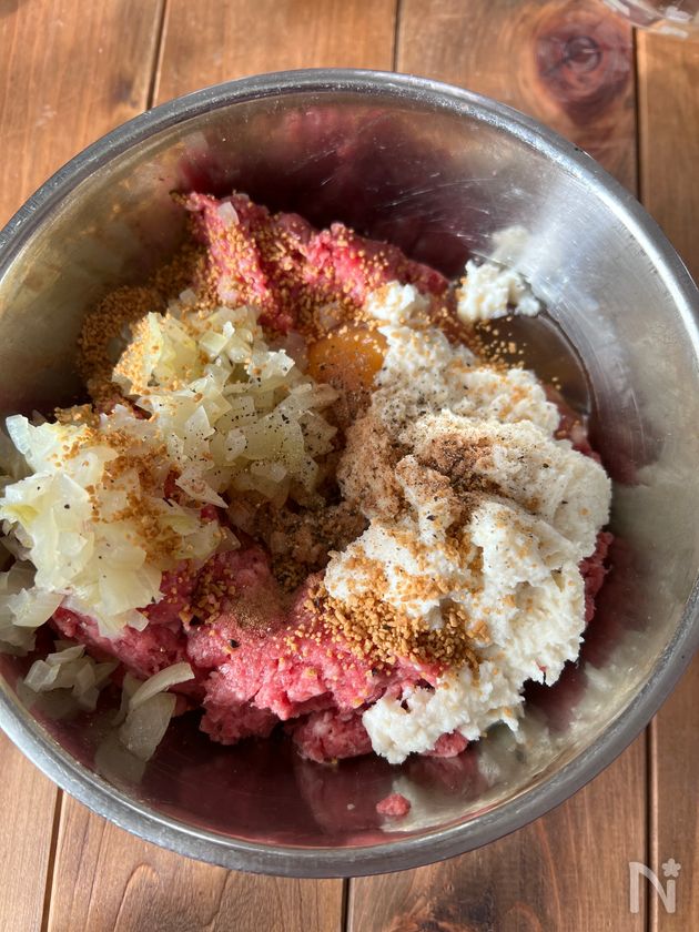 (1) ボウルに合い挽き肉と塩を入れ、粘り気が出るまで捏ねる。