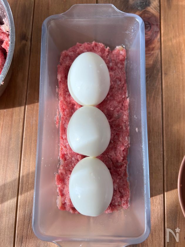 (2) パウンド型の1/3の高さまでタネを入れたら、ゆで卵を並べる。残りのタネをぎゅっと詰める。