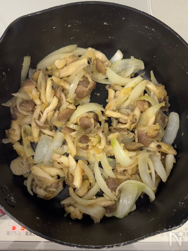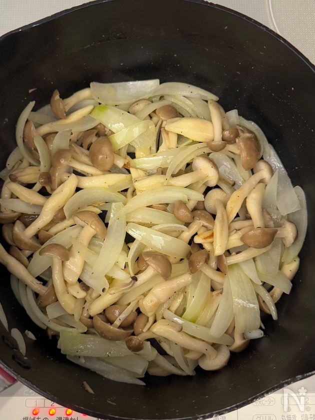 (2) 鍋に有塩バターを引き、玉ねぎとしめじに、塩、こしょう、ガーリックパウダーをふり、弱めの中火で、焦がさないように炒める。