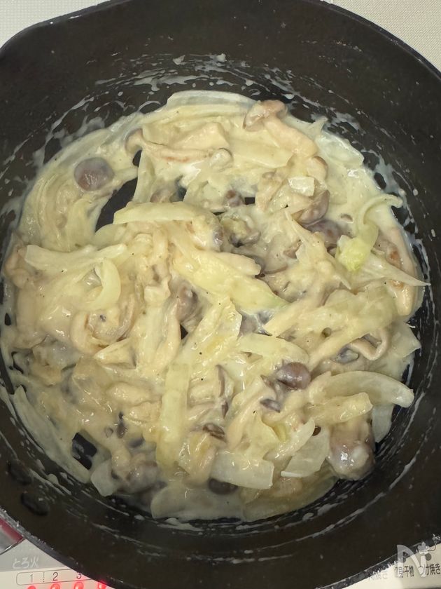 (3) しめじと玉ねぎがしんなりしたら、小麦粉をいれ、1~2分、粉っぽさがなくなるまでしっかり炒める。