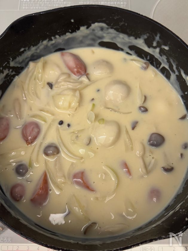 (6) 里芋、ウインナー、コンソメ(固形)を入れ、温める。