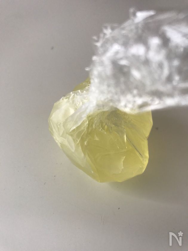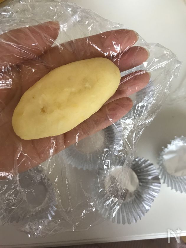 (4) ラップでさつまいもをにぎって、お好みの形にします。(楕円形・マル型)
