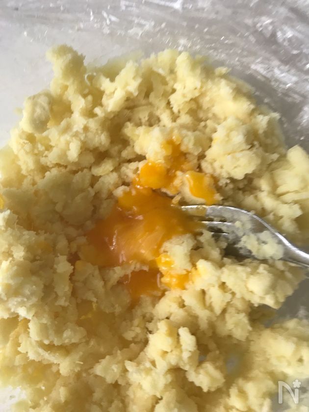 (3) 卵黄の2/3個分をさつまいもの中に入れて混ぜます。残りの1/3はツヤ用に残しておきます。