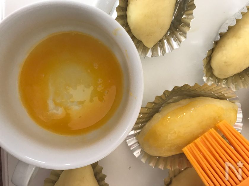(5) アルミカップに紙が付いていれば取って、型にさつまいもを入れて、残りの卵黄1/3個分を刷毛や、スプーンで塗ります。