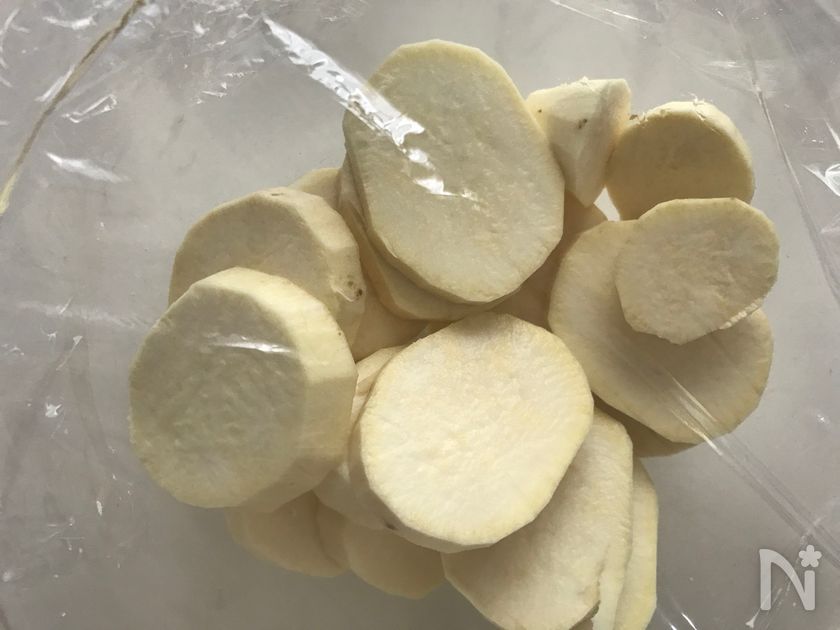 (下準備) さつまいもは皮をむき、1センチ程度の輪切りにして、水にさらしてあく抜きしておきます。(10分程度)