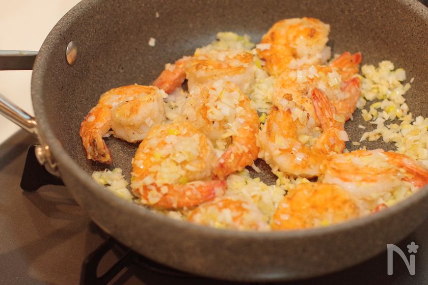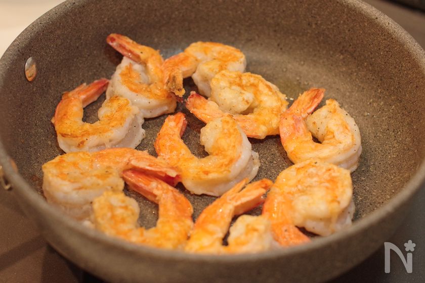 (3) 海老に片栗粉をまぶして、油をひいたフライパンで両面色が変わるまで焼く。(目安:片面2分)