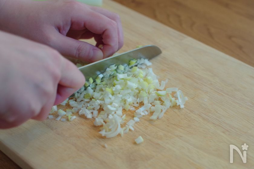 (2) ニンニク、白ネギ、生姜はそれぞれみじん切りにする。