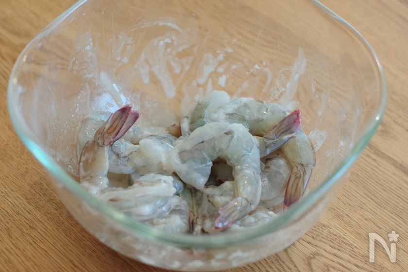 (1) バナメイエビは殻を剥き、背中に切り込みを入れて背腸を取る。【A】を加えて軽く揉みこみ流水で洗って水気をキッチンペーパーで拭き取る。