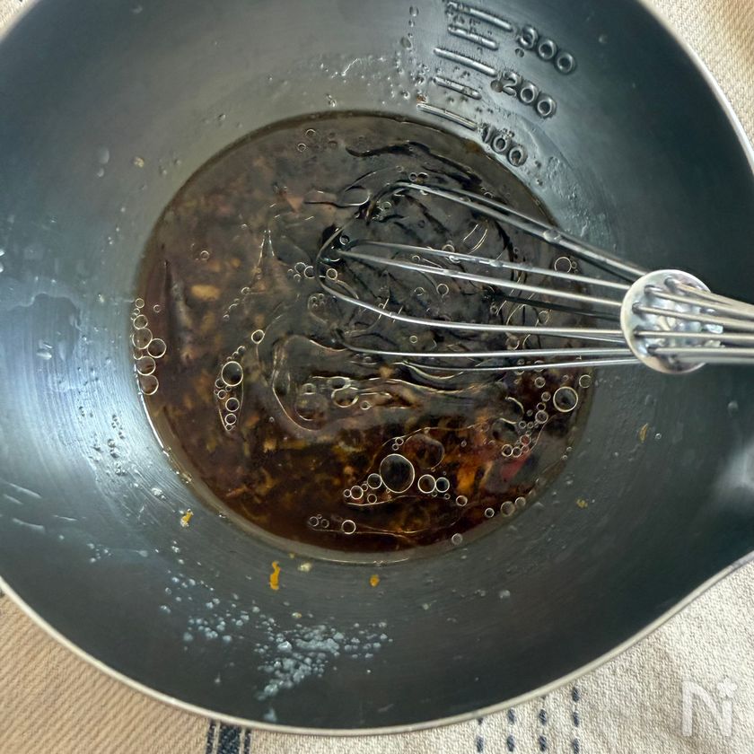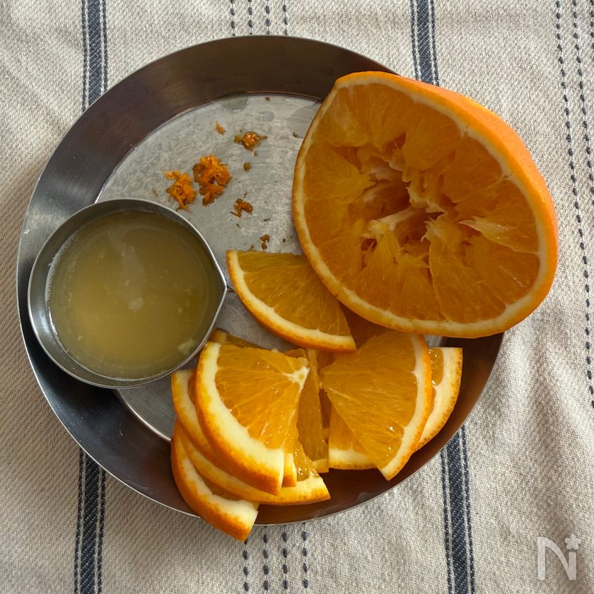 (2) ボウルに1のオレンジの皮と果汁、【A】の調味料を混ぜ合わせておく。