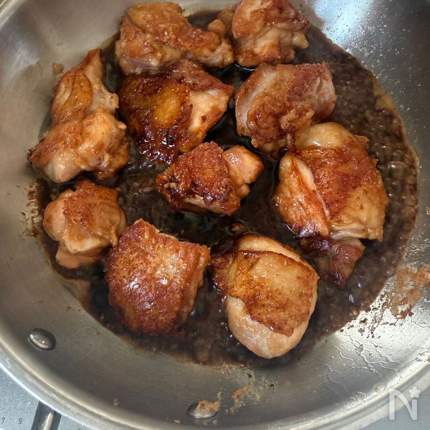 (4) フライパンにサラダ油を熱し、3の肉を皮面から焼く。