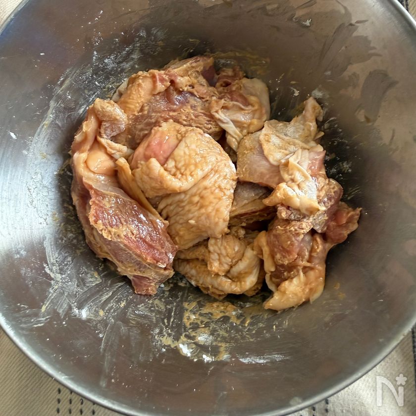 しょうゆ大さじ1/2をもみ込み、小麦粉を全体にまぶす。