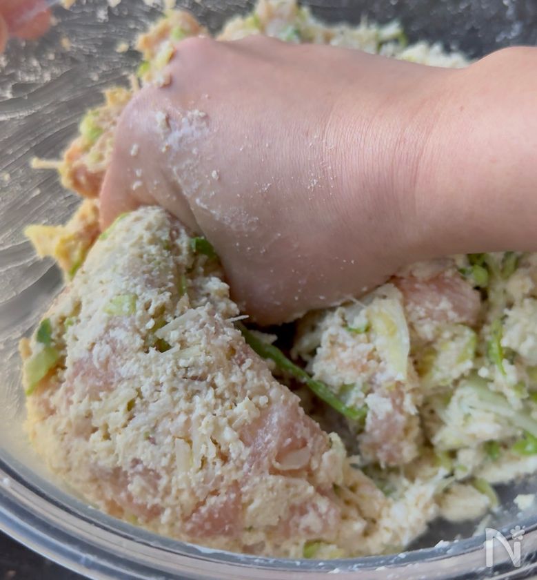(1) ボウルに鶏むね肉、水けを絞った冷凍豆腐、加熱済みの春キャベツ、えのき茸、【A】を加える。