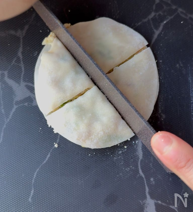 (3) 餃子の皮の上に2を乗せ、もう一枚を上にのせ手のひらで薄く伸ばす。